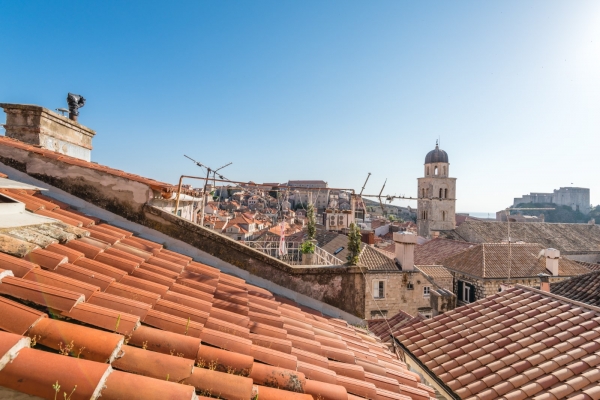 The view goes over the roofs of houses to the city walls, Stradun, and the fortresses Lovrijenac and Minčeta.