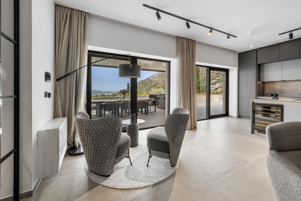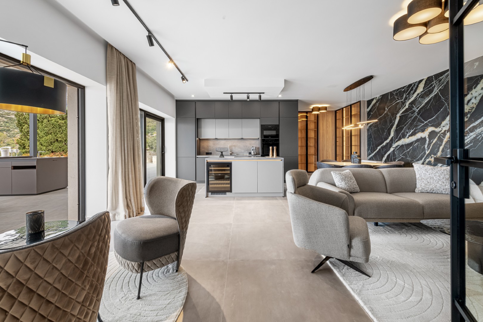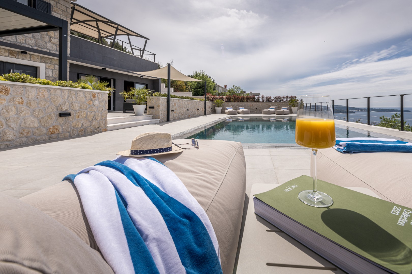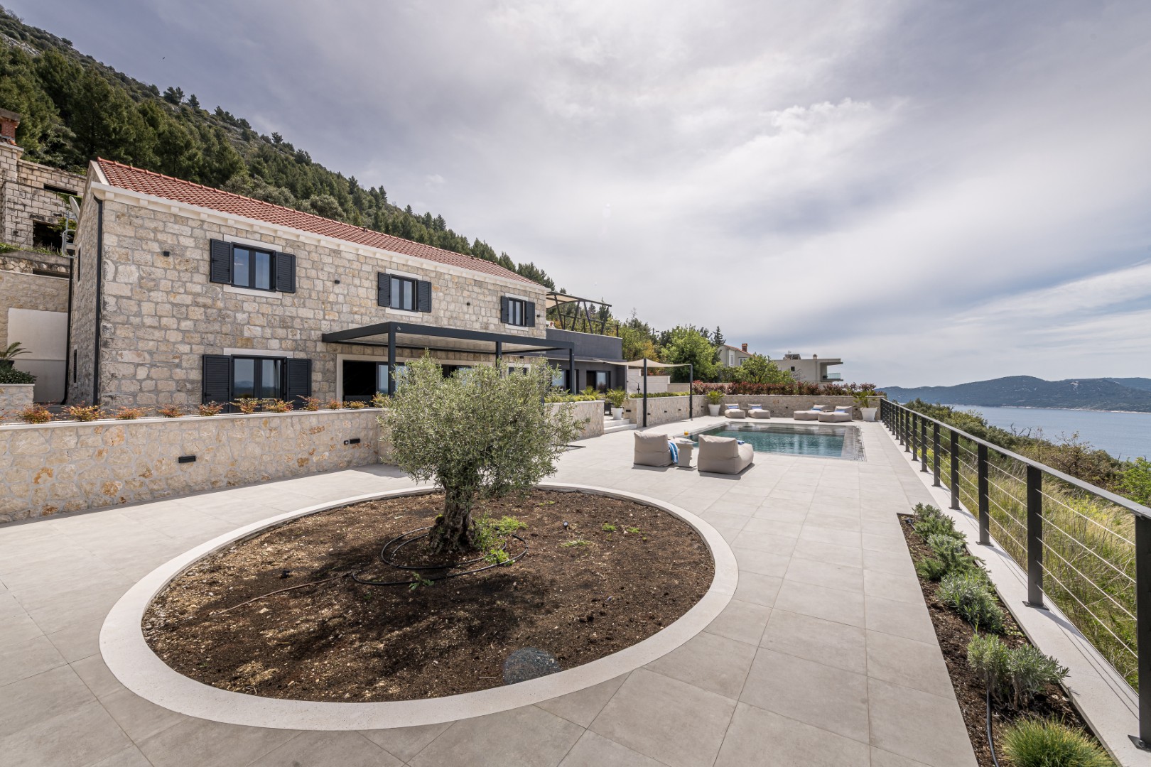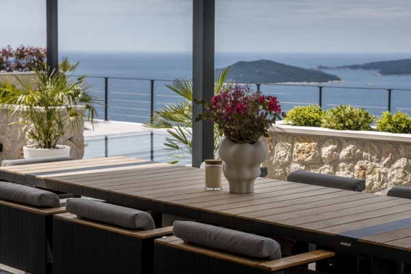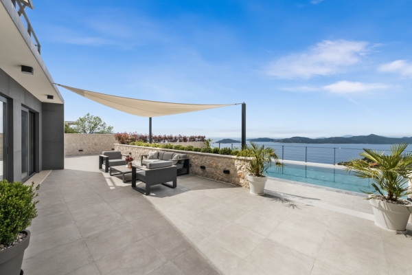 Vanjski dio kuće jednako je impresivan: prostrana terasa, bazen i uređeni vrt stvaraju idealno okružnje za uživanje i druženje tijekom cijele godine. Nekretnina se nalazi na izuzetnoj poziciji s koje se pruža otvoren pogled na more, dodatno naglašavajući osjećaj luksuza.