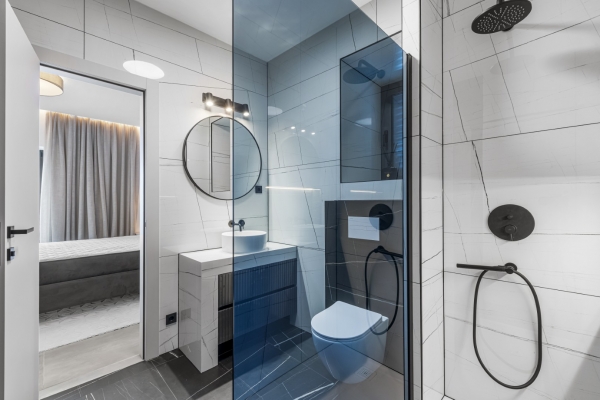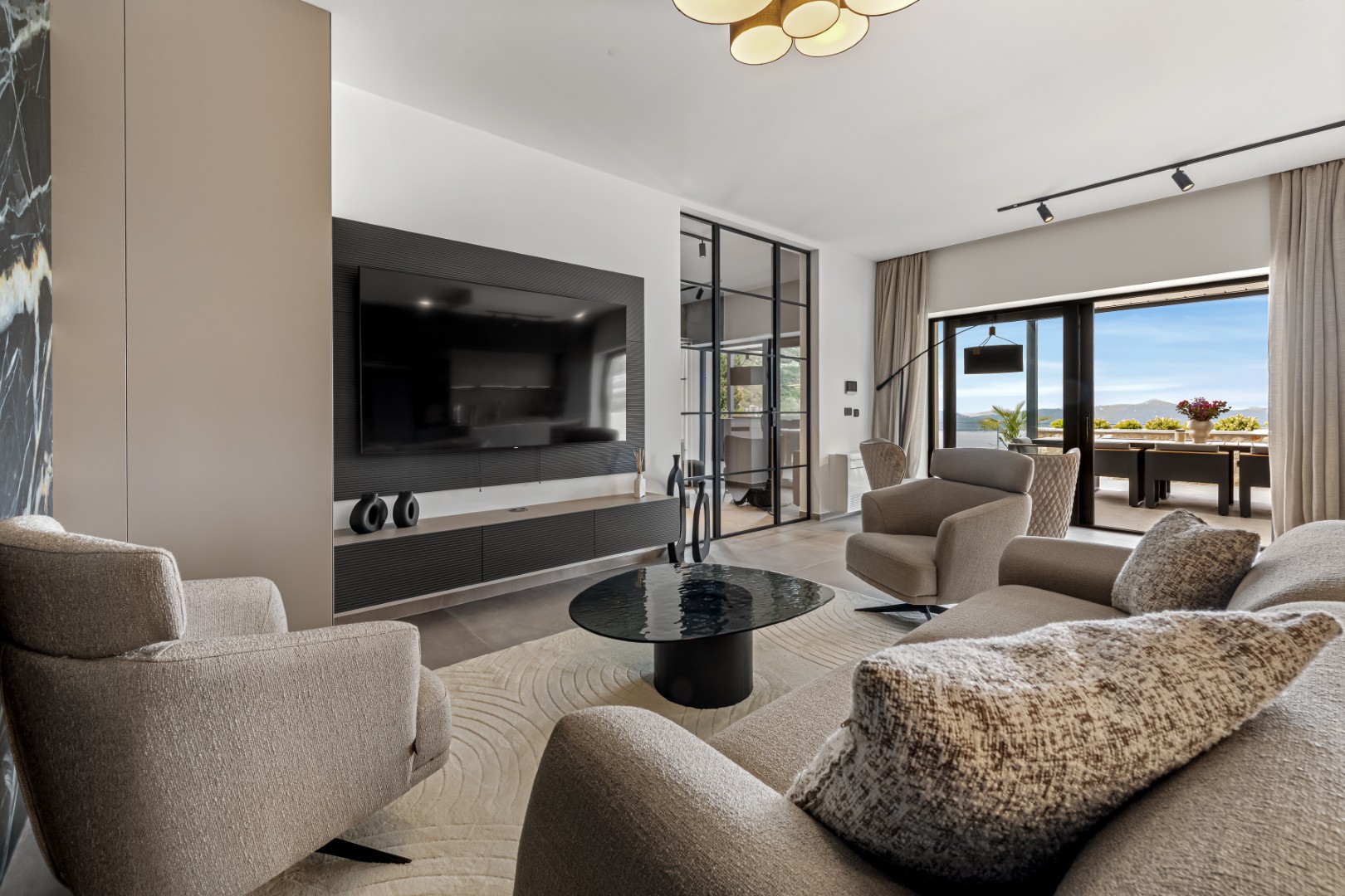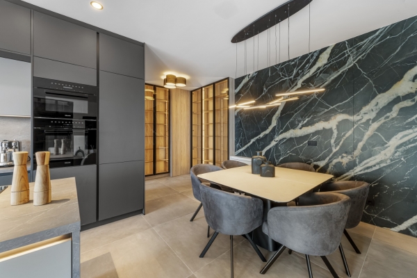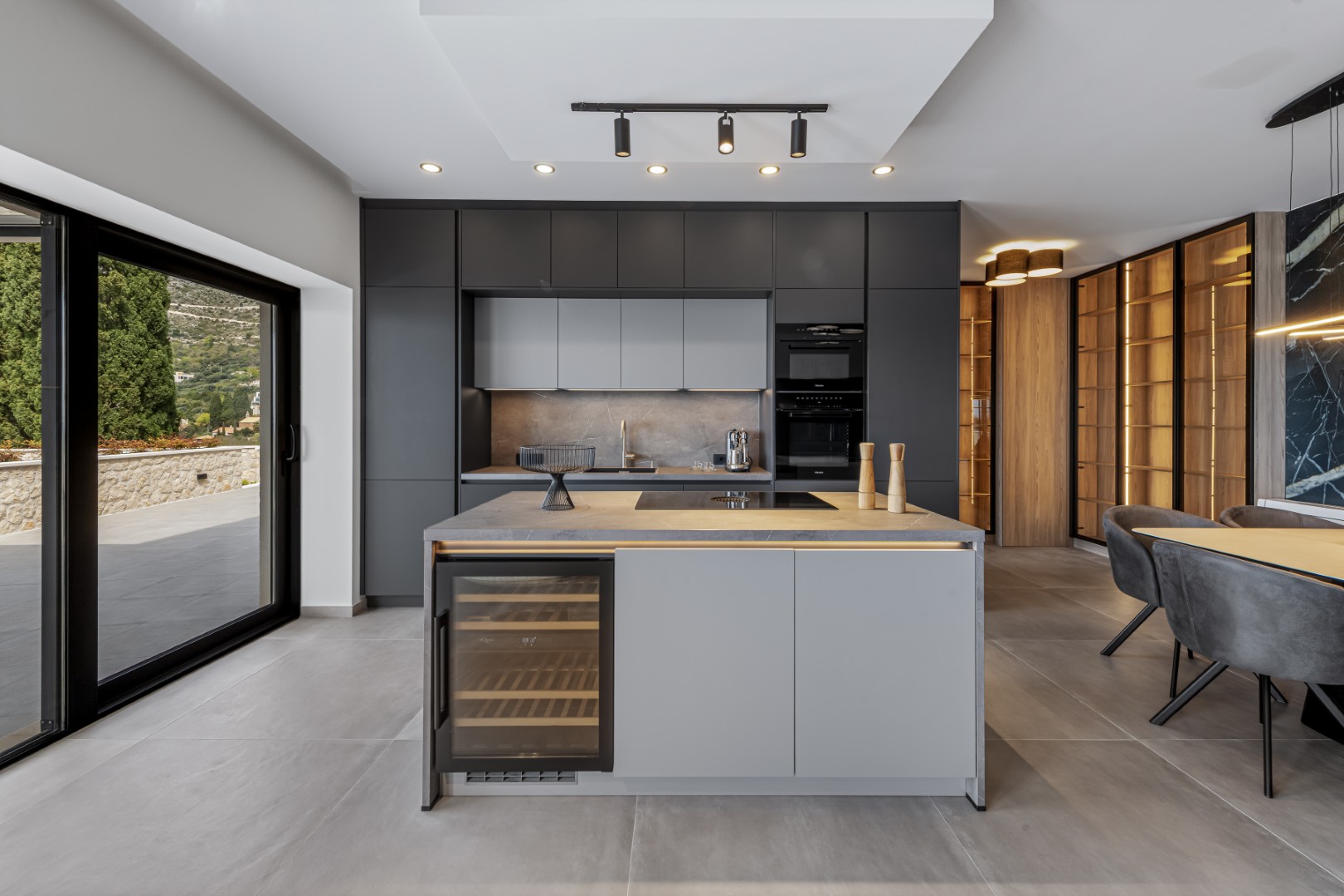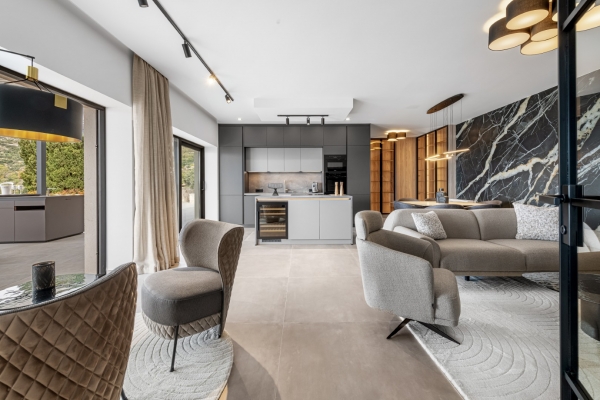 Interijer je moderno uređen, s naglaskom na crne dizajnerske elemente koji prostoru daju sofisticiran, elegantan karatker. Nekretnina je u potpunosti opremljena pametnom kućnom tehnologijom.